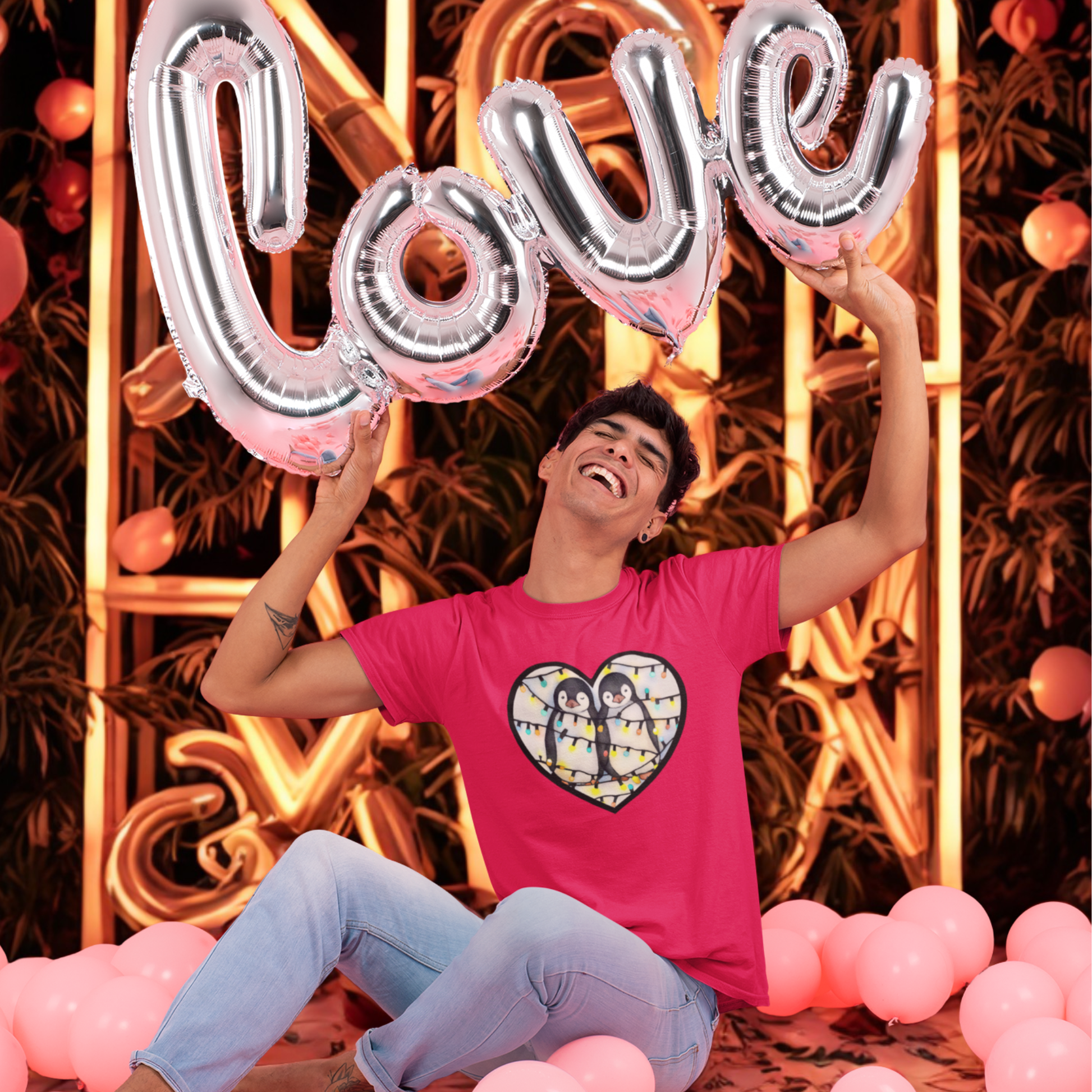 Picture yourself donning this shirt, spreading smiles and melting hearts wherever you go. The playful penguins and twinkling lights are a reminder that love comes in all forms, even in the adorable waddle of our feathered friends.