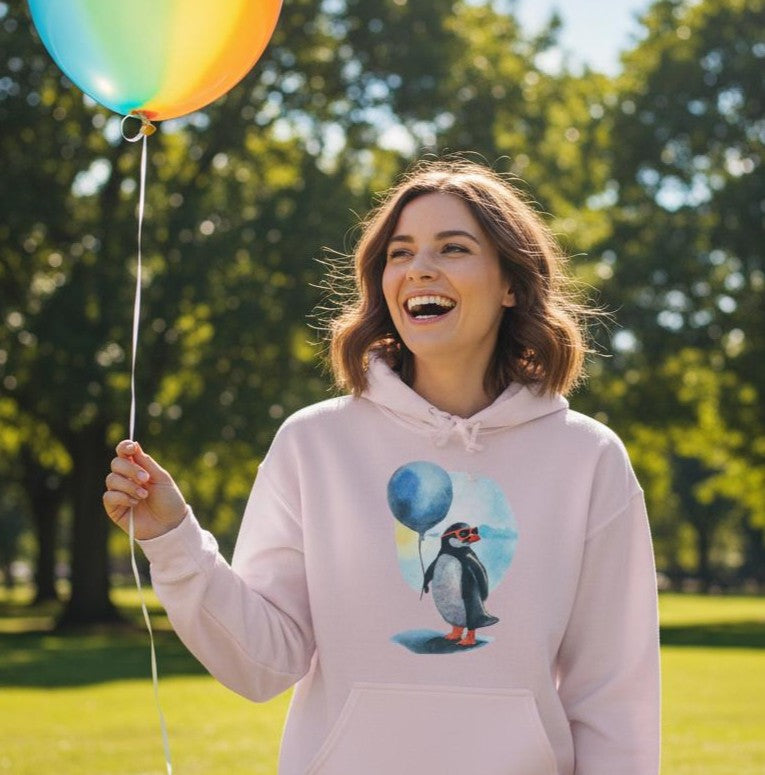 Slip into the laid-back charm of this whimsical design, where a watercolor penguin rocks its shades and clutches a balloon, turning your hoodie into an instant mood-lifter.
